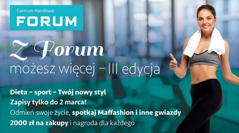 Prawdziwym hitem będzie spotkanie z niezwykle popularną blogerką Maffashion, która odwiedzi CH FORUM 1 kwietnia. Daty i goście pozostałych wydarzeń: 18 marca – wspólne gotowanie z Pascalem Brodnickim; 25 marca – wspólne ćwiczenia z Karoliną Szostak i klubem JATOMI Fitness; 8 kwietnia – wielki finał akcji, który uświetni wizyta Agnieszki Włodarczyk i Marii Konarowskiej (duet znany m.in. z reality-show „Azja Express” w TVN). Dzień finału będzie jednocześnie dniem piękna i urody, w którym zaprezentują się sklepy z tego sektora.