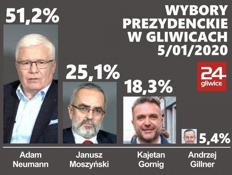 Nie będzie drugiej tury wyborów prezydenckich w Gliwicach. Wskazany przez Zygmunta Frankiewicza na swojego następcę Adam Neumann uzyskał ponad połowę głosów, tym samym wybory zostały rozstrzygnięte już w 5 stycznia.