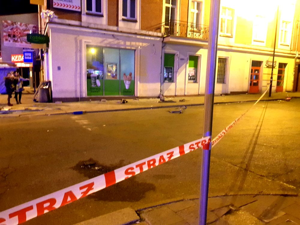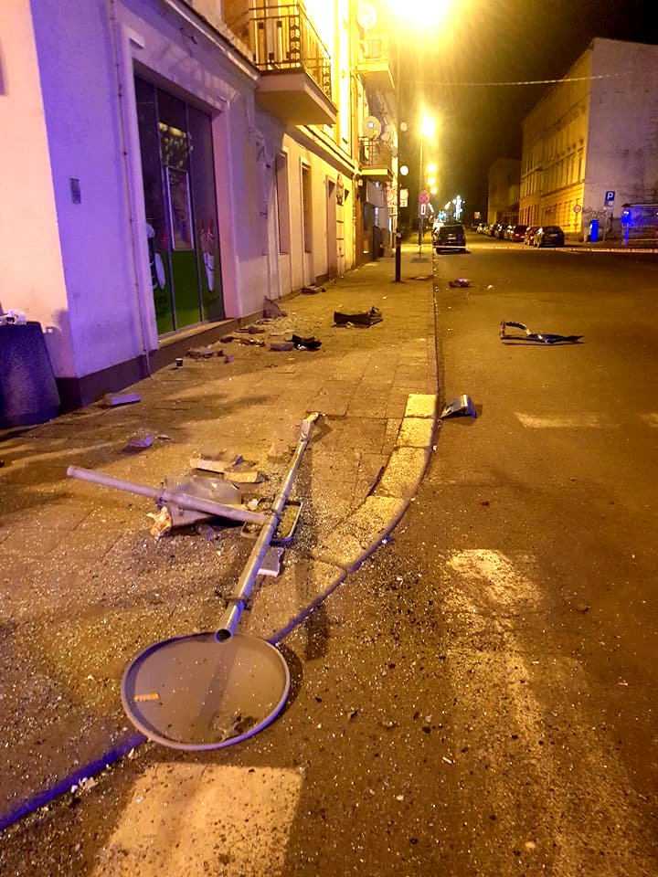 Zniszczone znaki drogowe, uszkodzone elewacje budynków, rozbity samochód osobowy – to efekt niecodziennej sytuacji, która miała miejsce w piątkowy wieczór na placu Piastów.