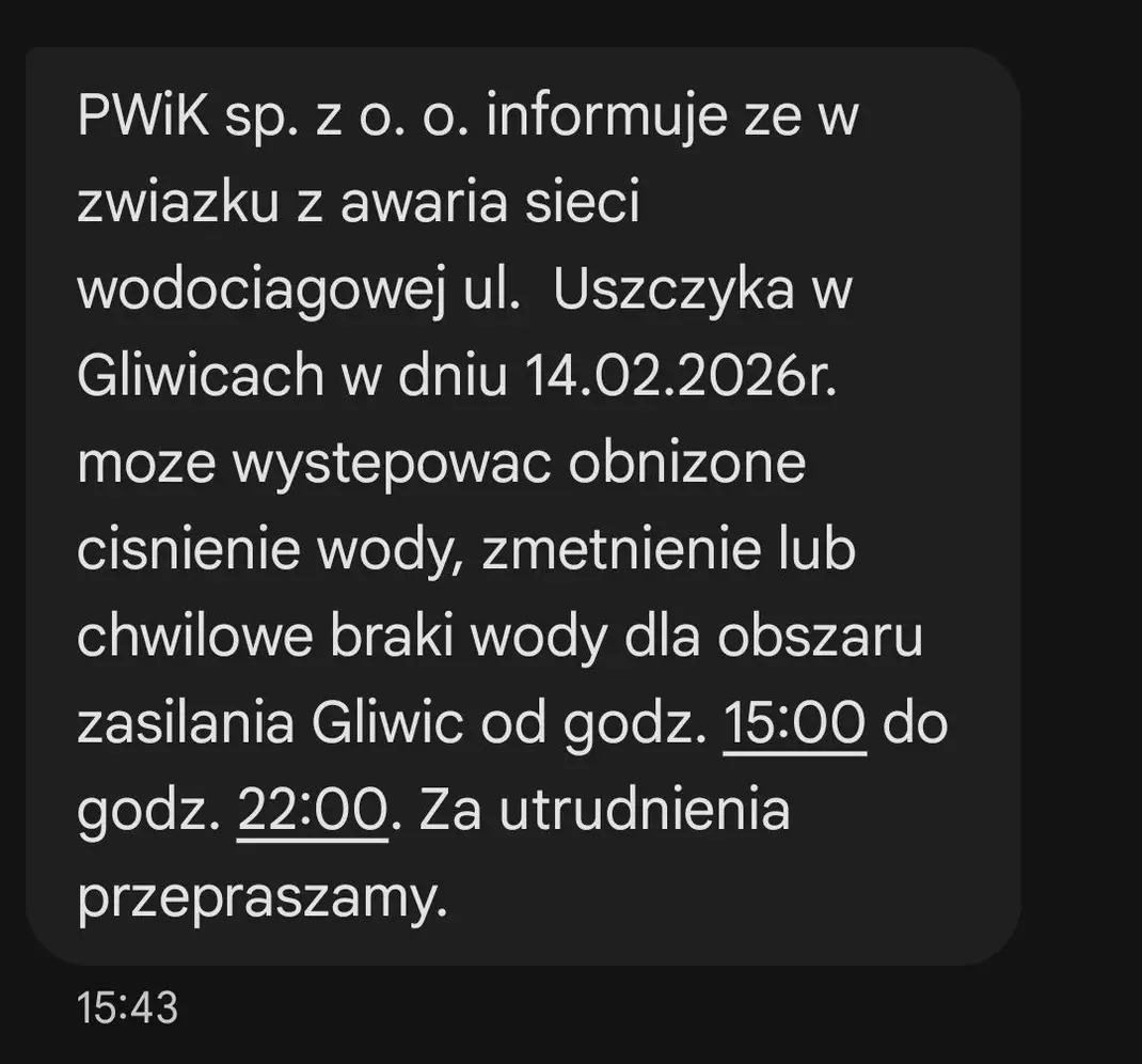 Awaria wodociągu w rejonie ulicy Uszczyka spowodowała, że w wielu dzielnicach Gliwic zabrakło wody w kranie, w innych była, lecz o obniżonym ciśnieniu. Na stronie PWiK nie zamieszczono komunikatu w tej sprawie. Internauci informują, że do przedsiębiorstwa nie można się dodzwonić.
