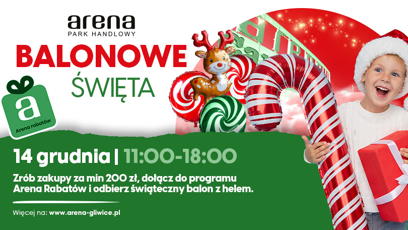 Już w najbliższą sobotę – 14 grudnia, czekamy w Parku Handlowym Arena na wszystkich dorosłych i towarzyszące im dzieci! Każdy, kto zrobi zakupy za minimum 200 PLN i zostanie członkiem klubu Arena Rabatów, otrzyma uroczy świąteczny balon wypełniony helem! Będzie go można od razu wręczyć swojemu dziecku lub zabrać domu. Przypominamy, że Arena Rabatów to specjalny program lojalnościowy dla miłośników zniżek, sekretnych ofert i upominków przyznawanych za zakupy w centrum.