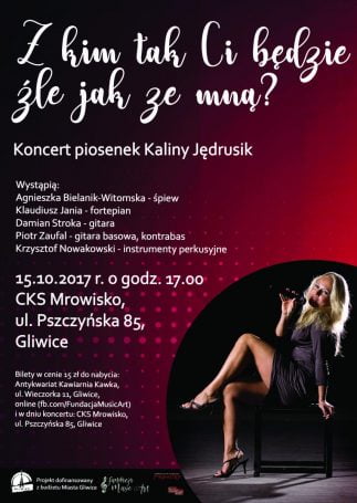 15 października w CKS Mrowisko (ul. Pszczyńska 85) z piosenkami Kaliny Jędrusik wystąpi Agnieszka Bielanik-Witomska. Koncert tworzą perełki z repertuaru gwiazdy Kabaretu Starszych Panów.