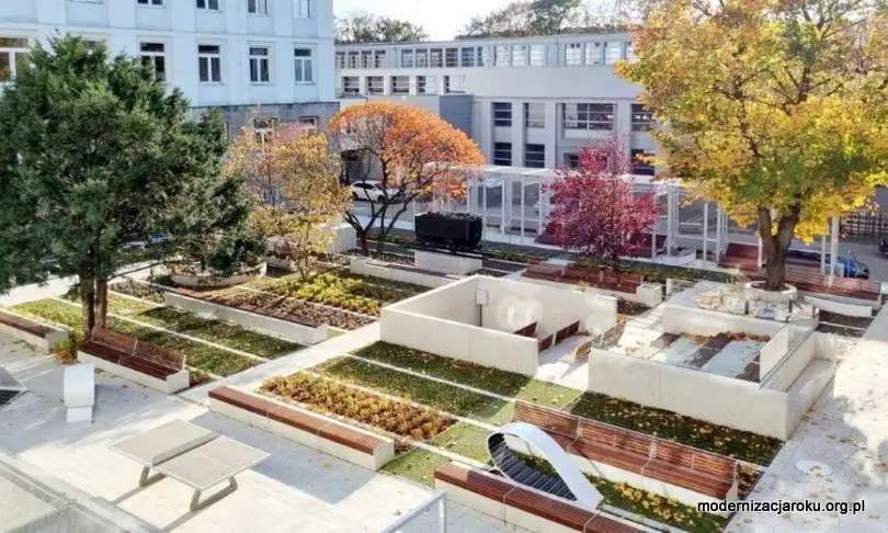 Zieleń została zintensyfikowana i dostosowana do zmian klimatu, między innymi przez zastosowanie mat z włókna kokosowego pokrytych sucholubnymi rozchodnikami. Od południa dziedziniec zamyka ażurowa pergola, która docelowo zarośnie pnączami glicynii.