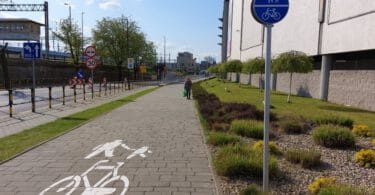 Oznakowanie na nawierzchni oraz stojące znaki drogowe określające ciąg pieszo-rowerowy...