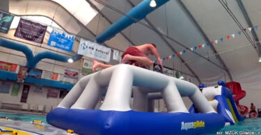 Wodne szaleństwo na torze przeszkód w krytej pływalni Neptun w Sośnicy – podczas...