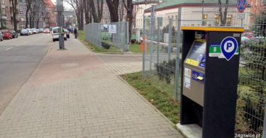 Dwa parkomaty, znak informujący o początku strefy płatnego parkowania, a pomiędzy jeszcze...