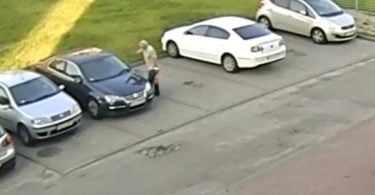 Starszy mężczyzna podchodzi do samochodu i uderza pięścią w szybę...