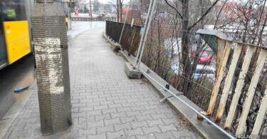 Zdjęcie uszkodzonej bariery drogowej na dojeździe do wiaduktu w ciągu ulicy Bohaterów...