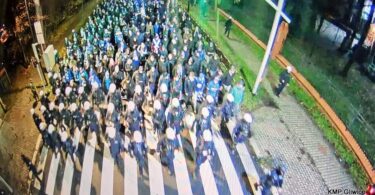 Przeprowadzają duże grupy kibiców z gliwickiego dworca do stadionu przy ul. Okrzei...