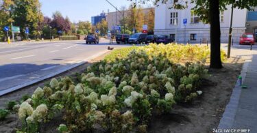 Odbrukowana powierzchnia jezdni biegnącej wzdłuż placu Piłsudskiego została obsadzona...