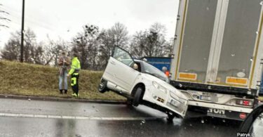 Nietypowa kolizja osobówki z ciężarówką na rondzie DTŚ. Auto wbiło...