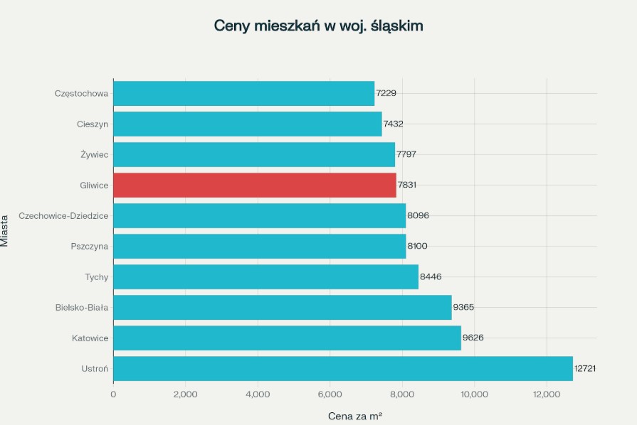 Gliwice zajmują 7. miejsce pod względem cen mieszkań wśród miast województwa śląskiego, z przeciętną ceną 7 831 zł za metr kwadratowy. Miasto oferuje mieszkańcom dobry kompromis między ceną a jakością życia, plasując się poniżej najdroższych kurortów jak Ustroń (12 721 zł/m²) czy dużych metropolii jak Katowice (9 626 zł/m²), ale powyżej większości miast regionu.