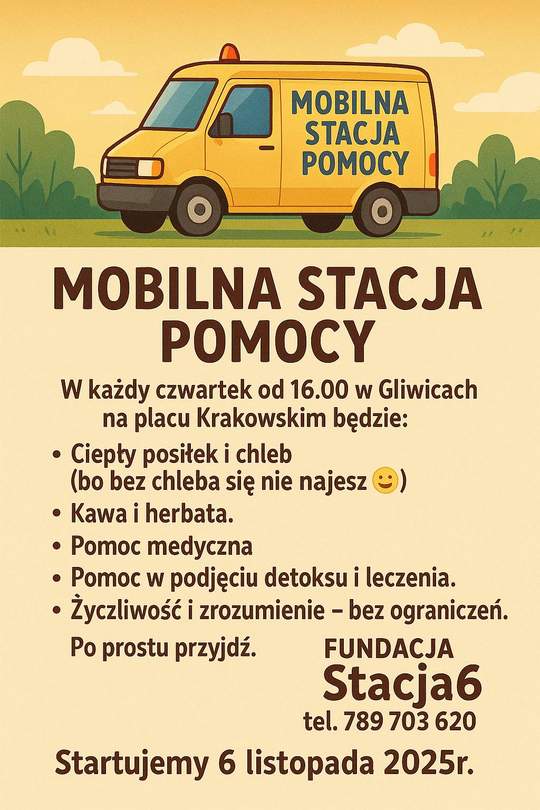 Według szacunkowych danych Fundacji Stacja6 na terenie Gliwic przebywa od 200 do 300 osób bezdomnych. By nieść pomoc takim ludziom organizacja chce utworzyć w naszym mieście Mobilną Stację Pomocy, gdzie wydawane będą ciepłe posiłki, a także inne rzeczy, pomocne szczególnie w okresie zimy. Założono zbiórkę na ten cel.