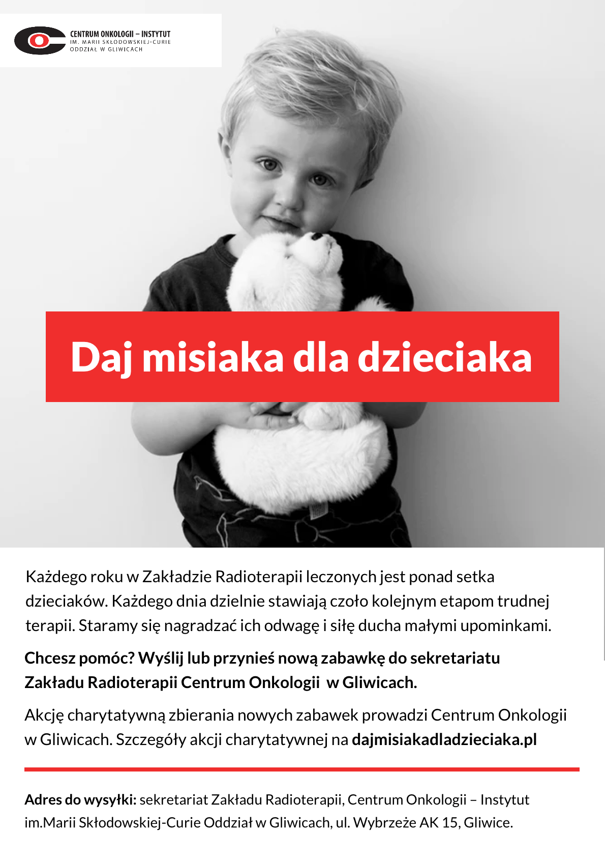 To właśnie pluszowe maskotki wręczane są małym pacjentom Instytutu. Osoby, które chciałyby wspomóc akcję podnoszenia na duchu chorych na nowotwory dzieci, może się do niej przyłączyć i przynieść lub przysłać zabawkę do sekretariatu Zakładu Radioterapii (ul. Wybrzeże Armii Krajowej 15).