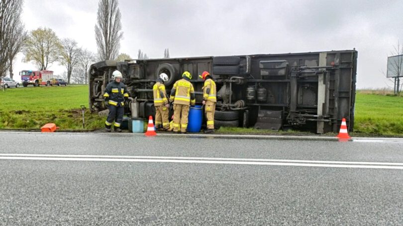 Strażacy zabezpieczali miejsce potencjalnego skażenia wód olejem napędowym. Wezwano też specjalistyczny wóz do wydobycia i postawienia ciężarówki na koła.