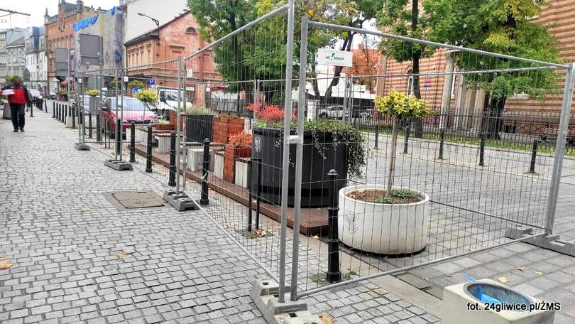 Na woonerfie zorganizowanym na odcinku ulicy Siemińskiego od rana w czwartek trwają przygotowania do prac serwisowych. Pracownicy firmy, której powierzono to zadanie, rozstawiają ogrodzenia wokół zamontowanych tam parkletów.