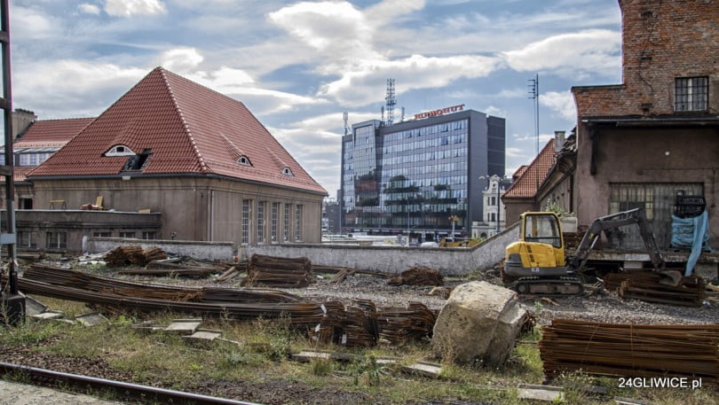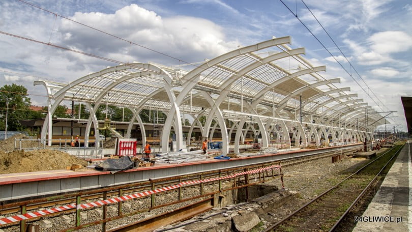 Nad peronami gliwickiego dworca PKP stoi już stalowa konstrukcja zadaszenia.