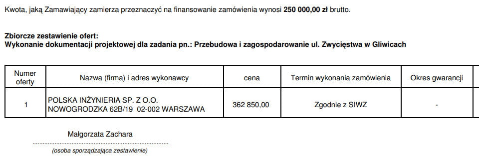 Jedyna spełniająca wszystkie warunki oferta, jaką złożono w zamówieniu publicznym, przedstawiona została przez warszawską firmę Polska Inżynieria Sp. z o.o., z siedzibą przy ulicy Nowogrodzkiej.