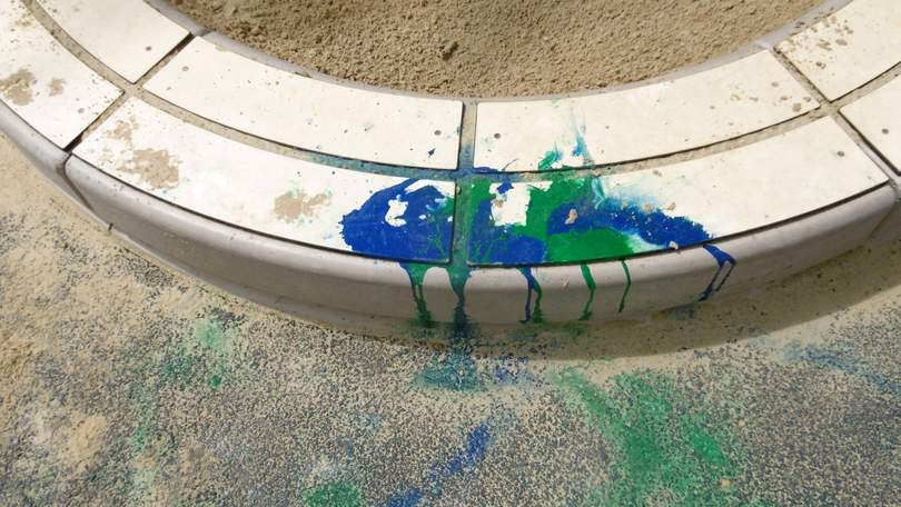 Warstwa farby jest tak gruba, że nie nadaje się do usunięcia. Trzeba wymieniać kostkę chodnikową. Obrzeże piaskownicy też jest obsmarowane