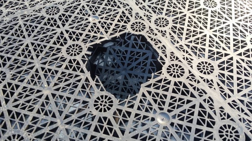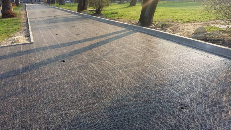 Panele zostały ułożone pod koniec ubiegłego tygodnia. Pisaliśmy o tym tu. Powierzchnia zastosowanych materiałów wytrzymuje nacisk do 70 ton na m2, ale jak widać, niezabezpieczone podłoże da się punktowo uszkodzić mechaniczne.