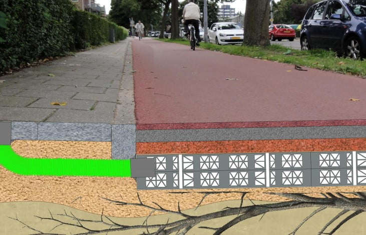 Lekki panelowy system polipropylenowy łączy w sobie funkcje podbudowy i drenażu. Dodatkowo specjalna szkieletowa konstrukcja paneli uniemożliwia korzeniom drzew przenikanie na powierzchnię ziemi zapobiegając efektowi „rozsadzania” nawierzchni ścieżki rowerowej.