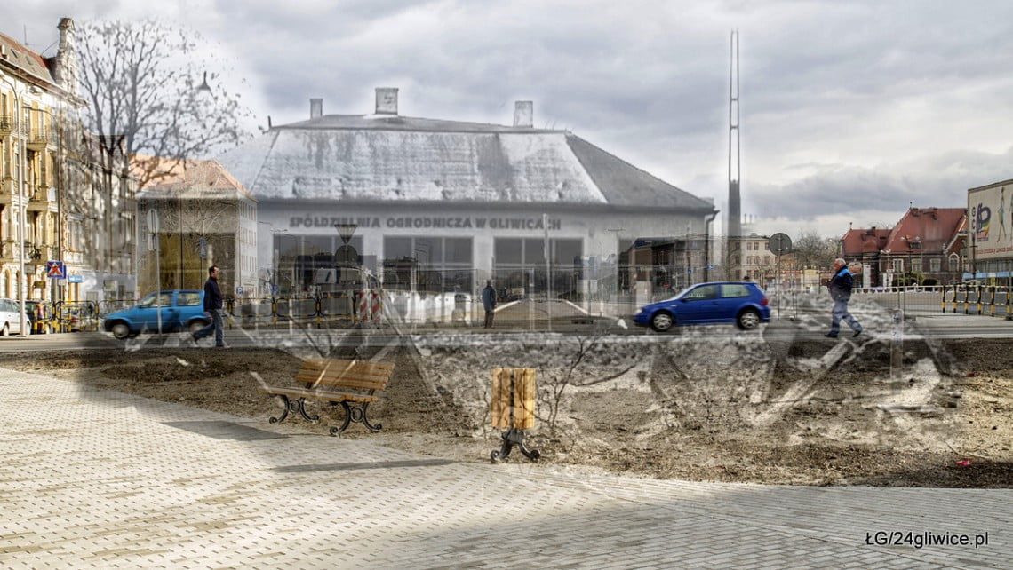 Ul. Zwycięstwa, obecnie okolice skweru i parkingu nad tunelem DTŚ. Oba zdjęcia powstały 11 lutego. To pierwsze z widoczną jeszcze “Mandarynką” w 2013 roku. Neon z popularnego sklepu spożywczego można znaleźć w Muzeum Neonu w Warszawie.