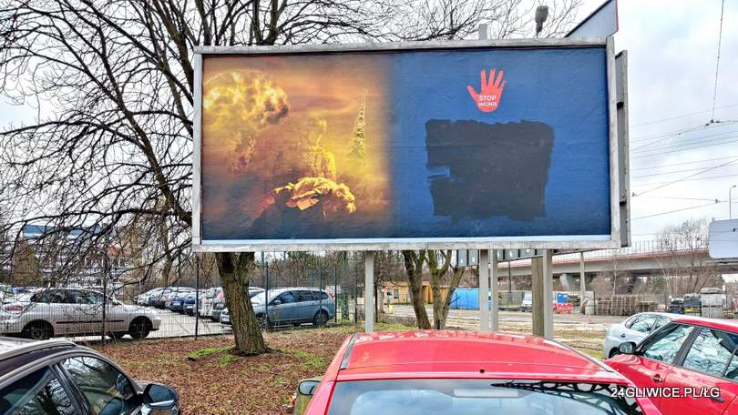 Prorosyjskie, pseudo-pacyfistyczne billboardy zlokalizowane przy ul. Chorzowskiej i Pszczyńskiej, zostały zamalowane farbą. Pozostał obrazek, nie ma już widocznego wcześniej napisu.
