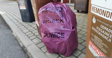 Fioletowe worki oraz pojemniki na zużytą odzież i tekstylia. Od...