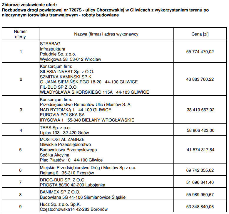 Zakończył się termin składania ofert w przetargu na przebudowę ulicy Chorzowskiej w Gliwicach. Zainteresowanych realizacją zamówienia jest 9 podmiotów. Najtańszą ofertę, wycenioną na 38,4 mln zł, złożyło konsorcjum, w skład którego wchodzi gliwicki PRUiM i EUROVIA POLSKA, najdroższa opiewa na blisko 70 mln zł.