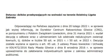 O tym, że mieszkańcy obawiają się dzikich zwierząt pisaliśmy niemal równo rok temu. Wówczas również radni z PiS interesowali się sprawą i pisali do CRG. Centrum zaś informowało o planie redukcji gliwickiej populacji w postaci odstrzału 150 sztuk dzików – inne, mniej drastyczne rozwiązania tego problemu nie były możliwe ze względu na trwającą epidemię ASF (afrykańskiego pomoru świń).