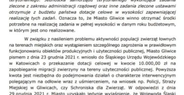 Pod koniec grudnia urzędnicy wystosowali kolejne pismo w tej sprawie do Śląskiego Urzędu Wojewódzkiego, wnosząc tym razem o o przekazanie dotacji celowej w kwocie 10 tys. zł na zapobieganie migracji zwierzyny na tereny użyteczności publicznej.