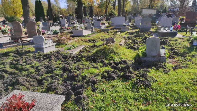 Zdjęcia śladów po działalności dzików pojawiły się w grupie “Ligota Zabrska 24 info” we wtorek rano. Wiele komentarzy pod wpisem dotyczy niewłaściwego zabezpieczenia bram do nekropolii i niedziałających klamek.