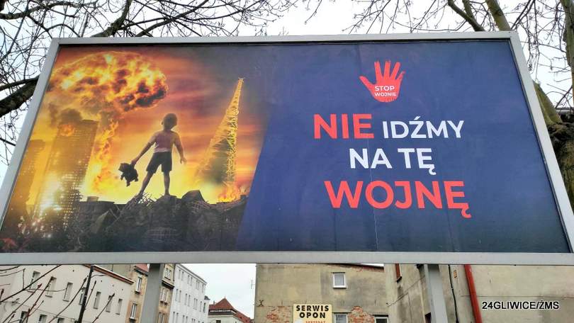 Billboard, który ma zniechęcać do angażowania się Polski w pomoc zaatakowanej przez Rosję Ukrainie, stanął tuż obok wjazdu do marketu przy ulicy Pszczyńskiej. “Nie idźmy na tę wojnę” – głosi widniejące na reklamach hasło.