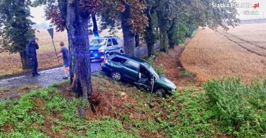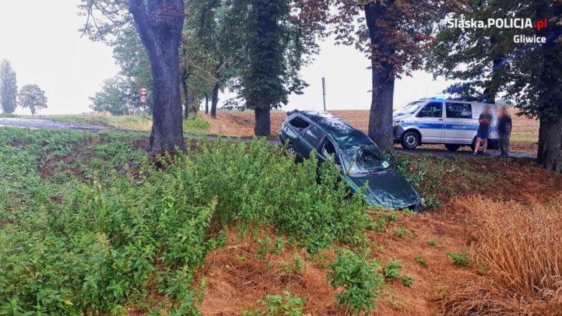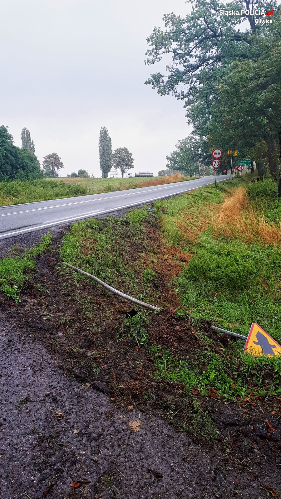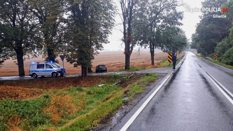 W środę po godzinie 7:00 na DK 40 (wysokość Rudzińca) kierujący samochodem osobowym marki Volvo, jadąc od strony Pyskowic w kierunku Ujazdu, na bardzo niebezpiecznym i zdradliwym zakręcie w prawo, w czasie obfitych opadów deszczu, nie dostosował prędkości do warunków panujących na drodze, stracił panowanie nad samochodem i wpadł w poślizg.