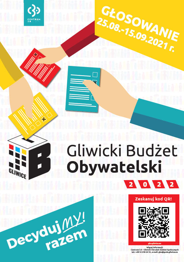 Zapraszamy do udziału w głosowaniu i zachęcamy do konsultacji osobistych i telefonicznych z pracownikami Centrum 3.0. Zespół ds. GBO działa w filii przy ul. Jagiellońskiej 21 w Gliwicach (e-mail: gbo@gods.gliwice.pl, tel. 32/238-24-55, 734-150-808). DecydujMY!