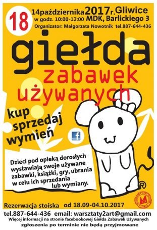 – To jedna z pierwszych tego typu imprez w naszym regionie, która dwa razy w roku (raz jesienią, raz na wiosnę) gromadzi rodziców i dzieci chcących kupić, sprzedać lub wymienić zabawki i książki. Giełda jest nie tylko świetną okazją do “upolowania” czegoś wyjątkowego, ale też wspaniałą lekcją finansów dla najmłodszych. Kto chce sprzedawać, musi najpierw zainwestować w stoisko, potem w przemyślany sposób wycenić swoje zabawki, a następnie dobrze je zareklamować kupującym, a nawet umiejętnie się targować! – przypomina Zofia Kozłowska z gliwickiego MDK-u.