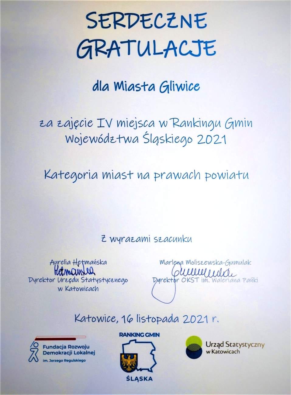 Gliwice zajęły 4. miejsce w kategorii miast na prawach powiatu w pierwszej edycji Rankingu Gmin woj. śląskiego, przygotowanego przez Fundację Rozwoju Demokracji Lokalnej im. Jerzego Regulskiego we współpracy z Głównym Urzędem Statystycznym.