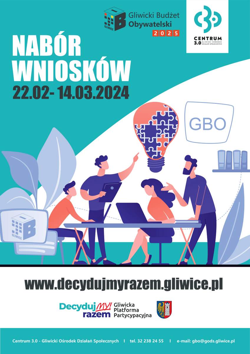To bardzo proste. Można skorzystać z formularza elektronicznego na platformie DecydujMY razem! pod internetowym adresem decydujmyrazem.gliwice.pl, gdzie znajduje się również poradnik dla wnioskodawców. Wnioski można złożyć także papierowo, bezpośrednio w siedzibach Centrum 3.0 – Gliwickiego Ośrodka Działań Społecznych, w siedzibach Urzędu Miejskiego w Gliwicach, a także drogą pocztową, wysyłając wniosek na adres Centrum 3.0.