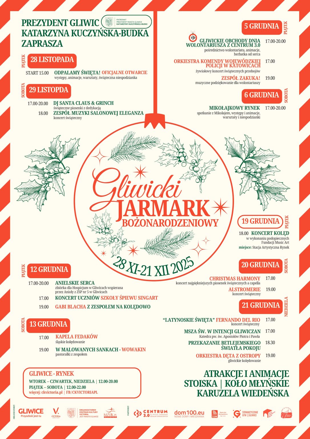 – Wśród wystawców pojawią się zarówno lokalni twórcy w domku „Made in Gliwice”, jak i goście prezentujący wiele innych ciekawych wyrobów. Świątecznego klimatu doda jarmarkowa scena, na której zaplanowano koncerty, animacje, wspólne kolędowanie i wydarzenia dla całych rodzin – informuje Zarząd.