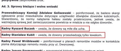 Radny Ryszard Buczek (PIS) uważa, że dzwony są miłe dla ucha. Radny Stanisław Kubit (KdGZF) uważa, że dzwony przeszkadzają tylko lewakom.