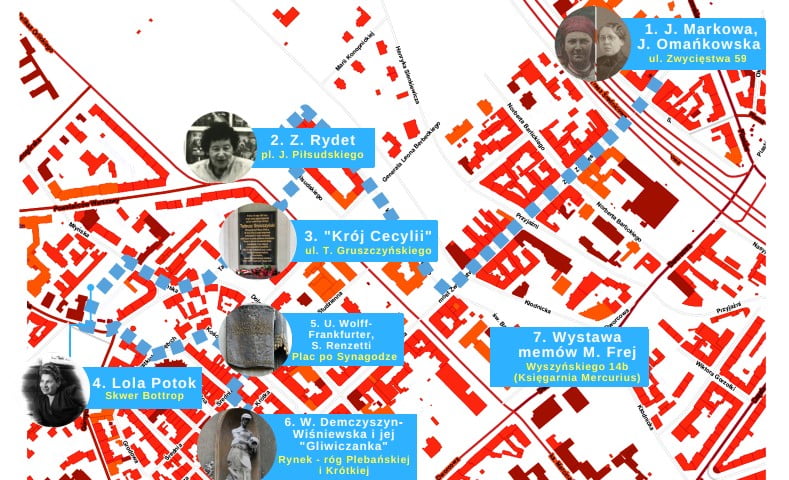 3. ul. T. Gruszczyńskiego (podcienie budynku ARCUS) – to miejsce poświęcone będzie bohaterce zbiorowej pierwszych miesięcy 1945 roku w Gliwicach, opowiemy o strachu, polityce, ale przede wszystkim o tajemnicy „kroju Cecylii”