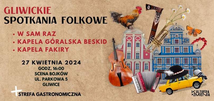 Po raz pierwszy Scena Bojków w Gliwicach wybrzmi tak głośno muzyką folkową – zarówno miejską, jak i góralską. Gliwickie Spotkania Folkowe to nowość w ofercie Gliwic i doskonała okazja do poznania różnych kultur. Wystąpią artyści, którzy tworzą autorską muzykę i szukają nowości, ale przy zachowaniu wartości tradycji ludowych.