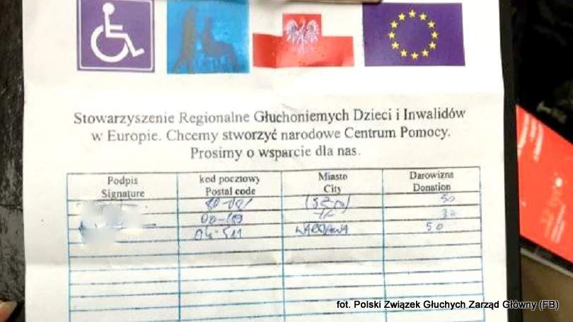 – Byliśmy z narzeczoną na zakupach w galerii i zaczepił nas pan obcej narodowości, wciskając wręcz nam kartkę z niby stowarzyszeniem dla głuchoniemych. Na tej kartce było dokładnie to, co na zdjęciu, które przesyłam. Nie podejrzewając nic, spojrzałem na tę kartkę i dałem zmyślony podpis oraz narzeczona dała temu panu 20 zł, za co bardzo dziękował. Takich osób może być więcej – informował Czytelnik.