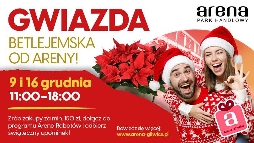 W przedświąteczne soboty 9 i 16 grudnia każdy, kto przyjdzie na zakupy do Areny, otrzyma świąteczny prezent. Wystarczy tylko wydać 150 PLN oraz zostać członkiem programu lojalnościowego Arena Rabatów, by w godz. 11.00 – 18.00 w punkcie promocji wymienić paragony na ozdobę świątecznego stołu – gwiazdę betlejemską. Każda roślina będzie wręczana w eko jutowej osłonce. Przypominamy, że Arena Rabatów to specjalny program lojalnościowy dla miłośników zniżek, sekretnych ofert i upominków przyznawanych za zakupy w centrum.