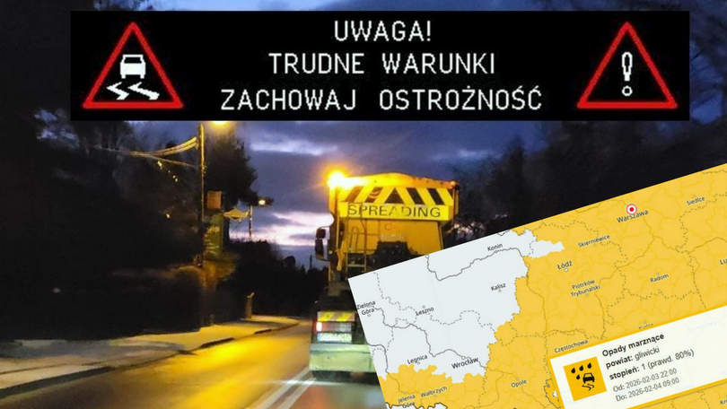 Instytut Meteorologii i Gospodarki Wodnej wydał ostrzeżenie pierwszego stopnia o opadach marznącego deszczu lub mżawki powodujących gołoledź, które obowiązuje dla 30 powiatów województwa śląskiego – na mapie znalazły się również Gliwice. Prawdopodobieństwo wystąpienia tych zjawisk wynosi obecnie 80%.