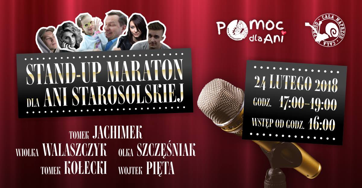 Stowarzyszenie Cała Naprzód zaprasza na stand-up z którego dochód w całości przekazany zostanie na pokrycie kosztów leczenia Ani Starosolskiej, zmagającej się z niezwykle rzadką chorobą – zespołem Cockayne’a.