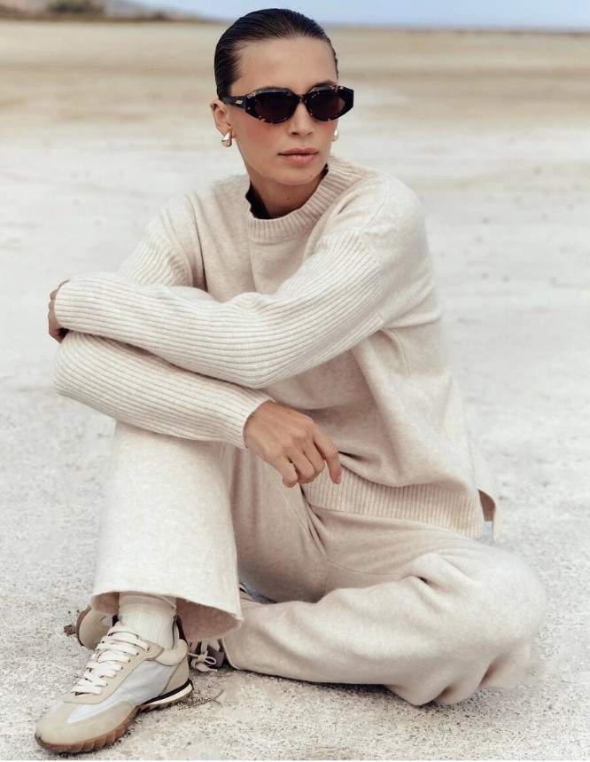 Dzianinowe komplety prezentują się znakomicie w połączeniu z różnorodnymi fakturami i dodatkami, które przełamują ich jednolitość: