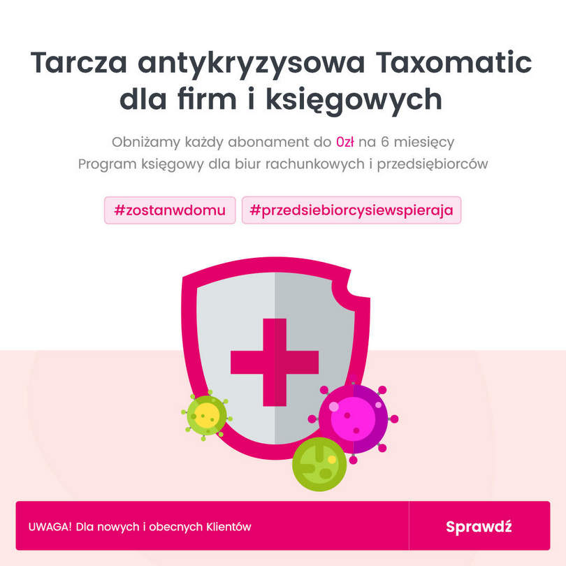 Ze względu na trudną sytuację gospodarczą w Polsce, Taxomatic przygotował swoją tarczę antykryzysową dla obecnych i nowych klientów. Program będzie dostępny za 0 zł przez 6 miesięcy.