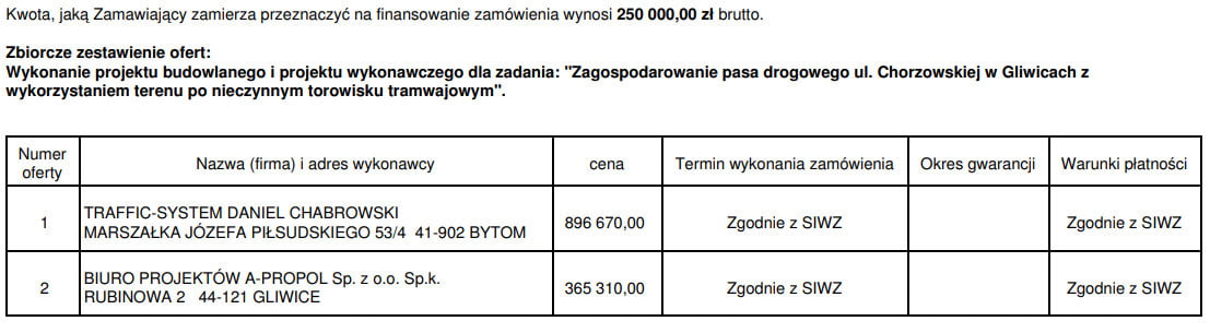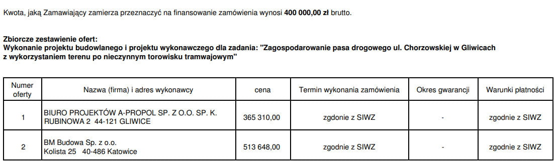 Dopiero trzecie postępowanie przetargowe przynosi szansę na pozytywne rozstrzygnięcie. W piątek ZDM opublikował zbiorcze zestawienie ofert – tym razem budżet na projekt ulicy Chorzowskiej wynosi 400 tysięcy złotych. Złożono dwie propozycje cenowe – co ciekawe jedna z nich już się pojawiła – gliwickie biuro projektowe A-PROPOL ponownie zaoferowało realizację zadania za 365 tys. zł, tym razem mieszcząc się w założonych na ten cel przez drogowców środkach. Druga oferta, katowickiej firmy, przekracza kwotę pół miliona złotych.