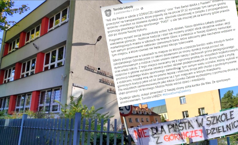– “NIE dla Piasta w szkole z GÓRNICZEJ dzielnicy” oraz “Pani B*** WARA z Piastem” możemy przeczytać na transparentach, które pojawiły się na płocie SP.32 – piszą kibice z grupy Torcida Łabędy w mediach społecznościowych. W piątek zamieszczono tam zdjęcia bannerów powieszonych na płocie placówki i obszerny komunikat na ten temat. Banery zniknęły po kilku godzinach.